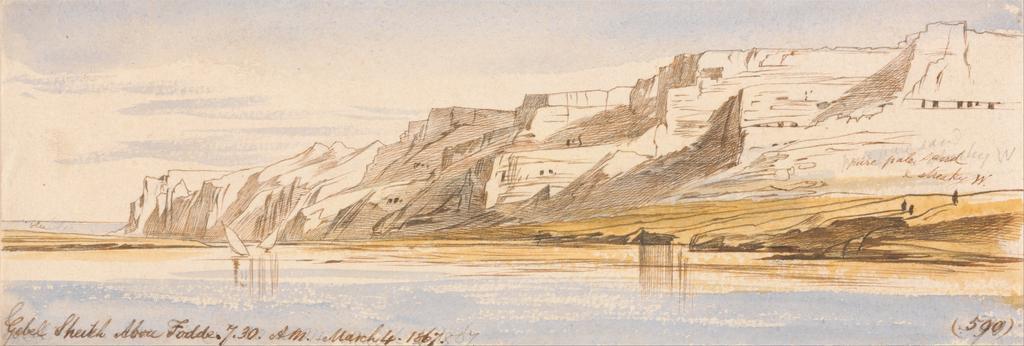 | Keywords: Edward Lear - Gebel Sheikh Abu Fodde, 7-30 am, 4 March 1867 (590) - Google Art Project.jpg inscribed in brown ink lower left Gebel Sheikh Abou Fodde 7 30 AM March 4 1867 ; in brown ink lower right 590 ; Verso in graphite upper left 159 up in graphite center next above lowest ; in graphite uppper center 315 Not on View Watercolor with pen in brown ink over graphite on thick rough cream wove paper sky rocks water windows cliffs river structures single built works figures representations landscape boats special url_id 9AFXnISz7v6NBA PD-old-100-1923 1888 Egypt by Edward Lear Nile in art Google Art Project works by Edward Lear |