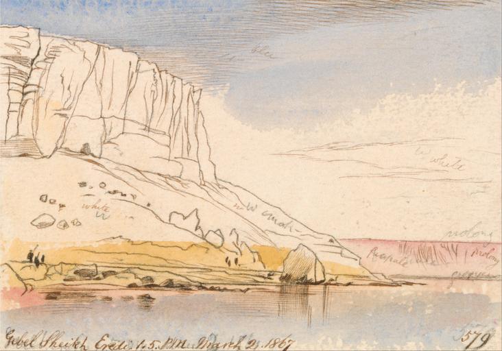 | Keywords: Edward Lear - Gebel Sheikh Eredi - Google Art Project (2294659).jpg inscribed in brown ink lower left Gebel Sheikh Eredi 1 5 PM March 2 1867 ; in brown ink lower right 579 ; Verso in graphite center 156 up Lowest ; in graphite upper right 311 Not on View Watercolor with pen in brown ink over graphite on thick rough cream wove paper sky rocks water cliffs river riverbank figures representations landscape special url_id GwGkO8BrMOS0XQ PD-old-100-1923 1888 Egypt by Edward Lear Nile in art Google Art Project works by Edward Lear |
