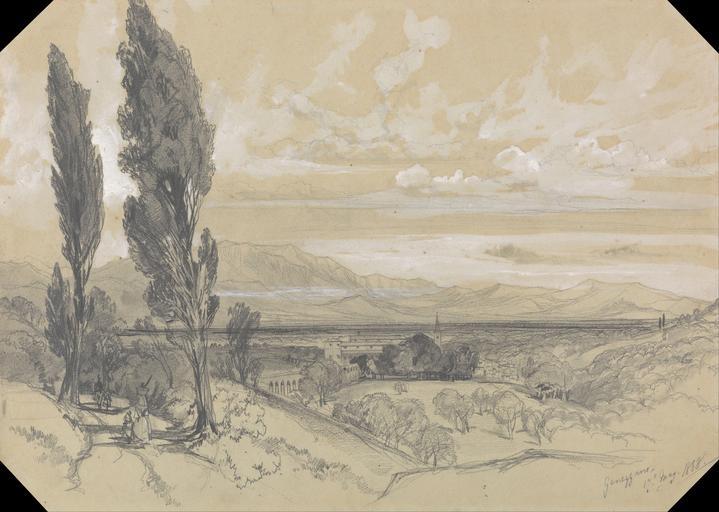 Keywords: Edward Lear - Genezzano, 17 May 1838 - Google Art Project.jpg Inscribed in graphite lower right Genezzano 17 May 1838 ; Verso in graphite upper center 41 upright middle Inscription _Signed_and_Dated Not signed Not on View Graphite with stumping and gouache on moderately thick moderately textured gray wove paper clouds sky figures landscape environment mountains hills trees buildings aqueducts road cityscape special url_id 7wHVdWasseJWyA PD-old-100-1923 1888 Drawings by Edward Lear Google Art Project works by Edward Lear |