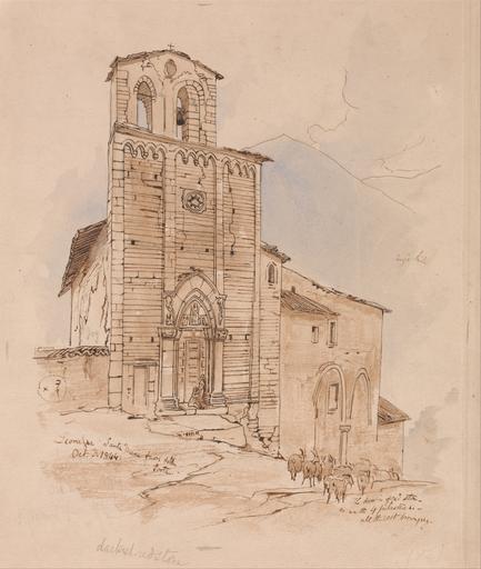 | Keywords: Edward Lear - Leonessa, 3 October 1844 - Google Art Project.jpg Inscribed in brown ink lower left Leonessa Santa Maria fuori della Porta Oct 3 1844 ; in brown ink lower right The door is stone- line of illegible inscriptions all the east Not on View Watercolor with pen in brown ink over graphite on moderately thick slightly textured beige wove paper architectural subject herd wall door windows archways figures building bell special url_id bQGoPsNKURN5fA PD-old-100-1923 1888 Watercolor paintings by Edward Lear Google Art Project works by Edward Lear |