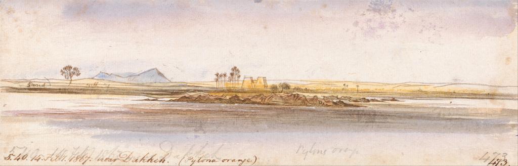| Keywords: Edward Lear - Near Dakkeh - Google Art Project.jpg inscribed in brown ink lower left 5 40 14 Feby 1867 near Dakkeh Pylona orange ; in brown ink lower right 473 ; Verso in graphite upper left 259 Not on View Watercolor with pen in brown ink and gouache over graphite on medium slightly textured wove paper mounted on moderately thick slightly textured cream wove paper sky water temple ruins river mountain trees landscape special url_id WAH5pxMRBawcxQ PD-old-100-1923 1888 Egypt by Edward Lear Google Art Project works by Edward Lear |
