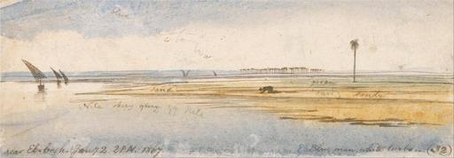 | Keywords: Edward Lear - Near Eb-bosh - Google Art Project.jpg inscribed in brown ink lower left; Near Eb bosh Jany 2 2PM 1867 ; in brown ink lower right blue man white turban 32 Not on View Watercolor with pen in brown ink over graphite on medium slightly textured wove paper mounted on moderately thick moderately textured cream wove paper palm trees water river sails figure representation landscape marine art boats special url_id gQGhnp5Hr5ctyw PD-old-100-1923 1888 Egypt by Edward Lear Google Art Project works by Edward Lear Egyptian feluccas in art |