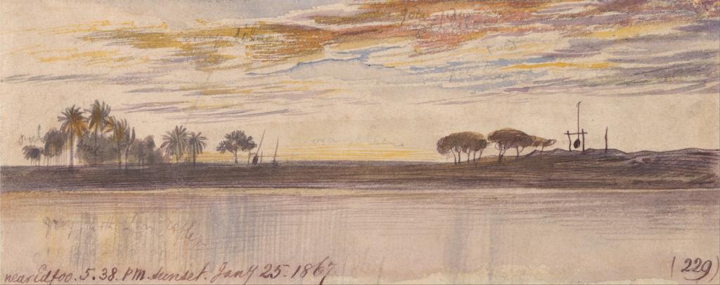 | Keywords: Edward Lear - Near Edfu - Google Art Project.jpg inscribed in purple ink lower left near Edfoo 5 38 PM Sunset Jany 25 1867 ; in purple ink lower right 229 ; Verso in graphite upper left 57 up next above lowest Not on View Watercolor with pen in brown and cochineal ink over graphite on moderately thick slightly textured beige wove paper sky sunset palm trees water river trees landscape special url_id 7gGr5LufBOPX9Q PD-old-100-1923 1888 Egypt by Edward Lear Google Art Project works by Edward Lear |