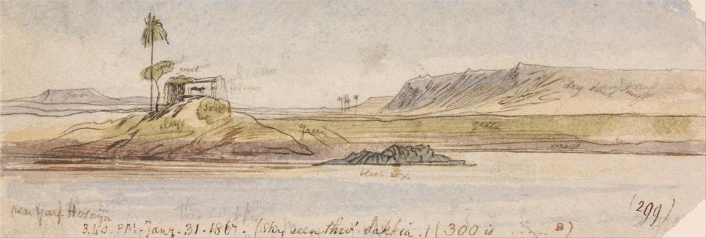| Keywords: Edward Lear - Near Garf Hossayn, 3-40 pm, 31 January 1867 (299) - Google Art Project.jpg inscribed with pen in brown ink lower left near Garf Hosayn 3 40 PM Janr 31 1867 sky seen thru Sakkia 1 300 is B 299 Not on View Watercolor with pen in brown ink over graphite on medium slightly textured wove paper mounted on moderately thick cream wove paper sky palm trees water ruins river landscape desert special url_id RQEJ0KyhFMCmsQ PD-old-100-1923 1888 Egypt by Edward Lear Google Art Project works by Edward Lear |