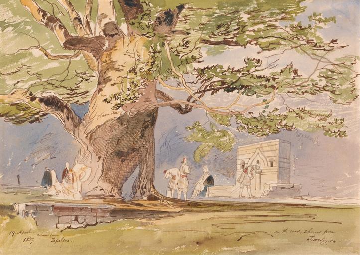 | Keywords: Edward Lear - On the Road, Two Hours from Tepelene, 19 April 1857 - Google Art Project.jpg Inscribed with pen in brown ink lower left 19 April 2 hours from 1859 Tepelene ; pen in brown ink lower right; on the road 2 hours from Tewedenern ; Verso in graphite upper right 32 encircled in graphite center; upright Lowest Not on View Watercolor with pen in brown ink over graphite on moderately thick rough beige wove paper grass figures landscape environment tree Stone buildings special url_id fgFojOLytTLi-w PD-old-100-1923 1888 Paintings by Edward Lear Google Art Project works by Edward Lear |