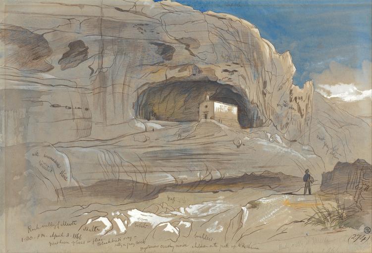 | Keywords: Edward Lear - Rocky Valley of Mosta, Malta, 1-30 p.m. (April 3, 1866) - Google Art Project.jpg Inscribed in artist's hand in pen and brown ink upper left alm ; in artist's hand in pen and brown ink upper center deep blue ; in artist's hand in pen and brown ink over graphite upper center deep gray ; in artist's hand in pen and brown ink over graphite center left all immense stone rounded ; in artist's hand in pen and brown ink center oker ; in artist's hand in pen and brown ink over graphite center right deep rusty very red oker very gray slope ; in artist's hand in pen and brown ink lower left Rocky Valley of Malta Malta 1 30 PM April 3 1866 great hum of bees or flies black birds' song - sitting on a gray rock ; in artist's hand in pen and brown ink lower center gray white bolder Mysterious crushy noise children on the path up to the shrine ; in artist's hand in graphite lower right Rocky Valley of Mosta Malta 3 April ; in artist's hand in pen and brown ink lower right 274 Inscription _Signed_and_Dated not signed Not on View Watercolor with pen in brown ink and gouache over graphite on medium slightly textured cream wove paper mounted on very thick smooth cream cardboard sky rocks boulders shrine cliffs valley landform vegetation structure single built work figure representation landscape special url_id iQG-OzW78BX7Cw PD-old-100-1923 1888 Google Art Project works by Edward Lear Malta by Edward Lear 1866 in Malta Mosta Valley |