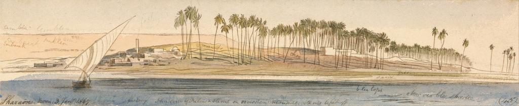 Keywords: Edward Lear - Sharaone - Google Art Project.jpg inscribed in brown ink lower left Sharaone noon 3 Jany 1867 ; in brown ink lower center Shadows of Palms Stems on uneven mounds Its my light off ; in brown ink lower right 45 ; Verso in graphite center right 67 Not on View Watercolor with pen in brown ink over graphite on medium slightly textured wove paper mounted on moderately thick slightly textured cream wove paper palm trees sand water river sail landscape boat special url_id IgE27ZP5fjNgLg PD-old-100-1923 1888 Egypt by Edward Lear Google Art Project works by Edward Lear