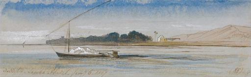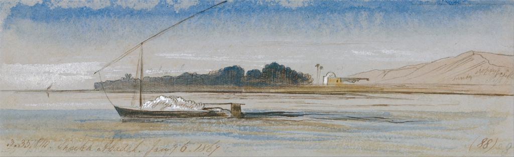 Keywords: Edward Lear - Sheikh Abadeh - Google Art Project.jpg Inscribed in brown ink lower left 3 35 PM Sheekh Abadeh Jany 6 1867 ; in brown ink lower right 88 ; Verso in graphite 18 up Lowest Not on View Watercolor with pen in brown ink and gouache over graphite on thick moderately textured gray wove paper sky water trees marine art boat special url_id 1gH351fr0xAI1Q PD-old-100-1923 1888 Egypt by Edward Lear Google Art Project works by Edward Lear Egyptian feluccas in art