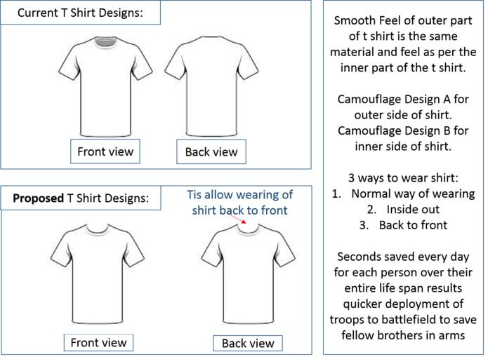 By removing the "back part" of the t shirt (see back view of t shirt in proposed design in image above) you remove the discomfort to your throat when you wear the t shirt from back to front. Smooth Feel of outer part of t shirt is the same material and feel as per the inner part of the t shirt.