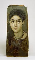 | Keywords: Egyptian - Female Portrait Mask - Walters 325.jpg  Hairstyles can be used to date female portrait masks Here the braids wound over the top of the head place the mask close to the period of the Roman emperor Trajan AD 98-117 The painting of a portrait was an occasion for all finery to be displayed and this woman is seen wearing a pearl and emerald necklace and earrings century 2 Roman Imperial encaustic wax pigments on wood cloth cm 44 18 9 1 4 accession number 32 5 5872 Dikran Kelekian New York and Paris date and mode of acquisition unknown Henry Walters city Baltimore Walters Art Museum Henry Walters Acquired by Henry Walters 1912 Bedazzled 5 000 Years of Jewelry from the Walters Art Museum Frist Center for the Visual Arts Nashville; The John and Mable Ringling Museum of Art Sarasota; The Walters Art Museum Baltimore 2006-2009 Transitions to Christianity Alexander S Onassis Public Benefit Foundation USA New York 2011-2012 Beyond the Pharaohs Egypt and the Copts in the Second to Seventh Centuries A D Museum of Art Rhode Island School of Design Providence; The Walters Art Gallery Baltimore 1989 place of origin Faiyum Walters Art Museum license Fayum mummy portraits Art of Roman Egypt in the Walters Art Museum Braids in art Paintings in the Walters Art Museum |