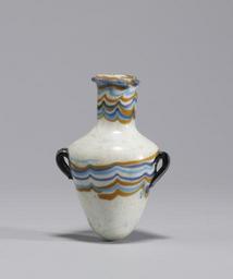 | Keywords: Egyptian - Glass Vessel with Handles - Walters 4731.jpg In addition to its use in jewelry amulets inlays and architectural decoration glass was used for vessels particularly distinctively shaped perfume bottles The two most common shapes take their names from Greek pottery amphoriskoi little amphoras and krateriskoi little kraters This vessel is an example of the former with its broad shoulders rounded base and opaque white ground It is a core-formed vessel; the technology of blown glass was as of yet unknown The molten mass composed of silica and natron heated to a temperature of around 1000°-1150° C was wrapped around a clay or dung core that was later removed Decorative bands were formed by pressing threads of colored glass onto the molten surface; combing the threads with a metal tool created decorative patterns ca 1450 1350 BC New Kingdom glass cm 11 4 7 8 5 9 accession number 47 31 28178 F G Hilton Price Sale London 1897 Dikran Kelekian Paris and New York date and mode of acquisition unknown Henry Walters city Baltimore Walters Art Museum Henry Walters Acquired by Henry Walters 1912 3000 Years of Glass Treasures from The Walters Art Gallery The Walters Art Gallery Baltimore 1982 place of origin Dra abu l Naga present-day Western Thebes Egypt Walters Art Museum license Ancient Egyptian pottery in the Walters Art Museum Ancient Egypt amphoriskoi Ancient Egyptian glassware Works of the Egyptian New Kingdom |