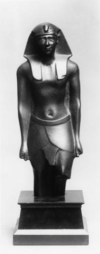 | Keywords: Egyptian - King Standing - Walters 22350.jpg This statue is sculpted in the round and depicts a King standing with a uraeus on his forehead He wears a long wig and has a stele at his back His nose has been restored The statue is broken off across the legs with holes from previous restorations The eyes are hollow and fitted with paste 664 BC-AD 313 Late Period-Greco-Roman black granite paste cm 34 3 accession number 22 350 7310 P Philip and Others Sale 1905 no 56 illustrated with restored feet and without restored eyes Dikran Kelekian New York and Paris date and mode of acquistion unknown as found at the Pyramids Henry Walters city Baltimore Walters Art Museum Henry Walters Acquired by Henry Walters 1912 place of origin Egypt Walters Art Museum license Ancient Egyptian statues in the Walters Art Museum Unknown pharaohs Media contributed by the Walters Art Museum needs category review |