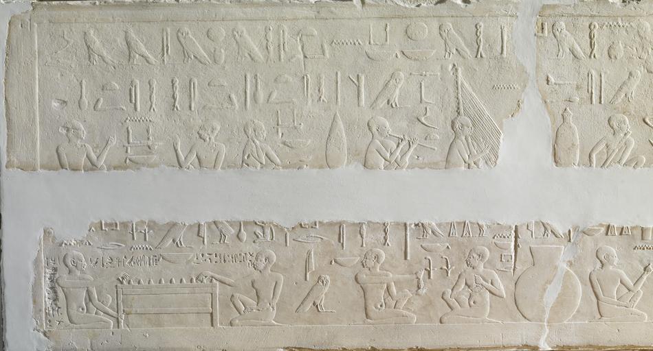 Keywords: Egyptian - Lintel with Musicians and Game Players - Walters 22152-22153 - Detail A.jpg This block probably once served as the lintel of a doorway in the tomb of Ankh-ef-en-sekhmet He is represented on the right side of the lintel Carved in very low relief this piece depicts musicians and game-players before the deceased Ankh-ef-en-Sakhmet The entire relief has a plain border running around its perimeter At the right is the deceased seated and facing left He sits upon a high-backed and armed chair with cow's legs which sits upon some type of mat He holds a staff in his right hand while his left hand rests on the arm of the chair In front of him is the upper part of a figure who places a lotus blossom in front of his face Behind him are three groups of performers the first one a harpist and a flute-player the second one a harpist and a double clarinet-player and the third one consisting of three singers; they are separated from each other by large vessels In the lower row is depicted a person who turns to grab the staff of Ankh-ef-en-Sakhmet followed by three pairs of game-players The group farthest to the right consists of two pairs of people playing the game mehen while the group behind them consists of two men playing senet There is a row of inscriptions at the top of the piece along with captions referring to each of the performers in the upper row and the words spoken by each of the members of the groups of game players in the lower row There are also intrusive inscriptions between Ankh-ef-en-Sakhmet's staff and the head of the lotus blossom-holder and in front of each of the two individuals playing senet in the lower left corner of the piece They were added in the 27th Dynasty in the time of Darius I and Artaxerxes I There is still a large piece missing between Walters 22 152 and 22 153 and a smaller piece missing between those two and the piece formerly in Seattle upper right There is a faint trace of red on the large figure's shoulder not quite large enough to establish that the whole was painted though it is quite possible that it was 550-525 BC; Secondary inscriptions 500-450 BC Late Period limestone with remains of red and black paint cm 48 144 ; framed cm 52 150 9 accession number 22 152-22 153 34307 22 152 Khawam brothers Dikran Kelekian New York and Paris Henry Walters city Baltimore Walters Art Museum 1931 by bequest 22 152C Seattle Art Museum date and mode of acquisition unknown Walters Art Museum 1957 by purchase 22 153 Khawam brothers Dikran Kelekian New York and Paris Henry Walters city Baltimore Walters Art Museum Henry Walters Acquired by Henry Walters 1930 and 1931 and Museum purchase 1957 In Search of Ancient Treasure 40 Years of Collecting The Walters Art Gallery Baltimore 1978 place of origin Memphis Egypt Walters Art Museum license Ancient Egyptian reliefs in the Walters Art Museum Ancient Egyptian art from Memphis Games of Ancient Egypt Musical instruments in ancient Egypt Board game piece hieroglyph Sbi symbol hieroglyph Lotus flower hieroglyph Arms spread out ka hieroglyph Arm hieroglyph Mehen game in Ancient Egypt Ankh-ef-en-sekhmet |