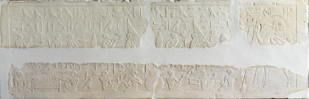 | Keywords: Egyptian - Lintel with Musicians and Game Players - Walters 22152-22153.jpg This block probably once served as the lintel of a doorway in the tomb of Ankh-ef-en-sekhmet He is represented on the right side of the lintel Carved in very low relief this piece depicts musicians and game-players before the deceased Ankh-ef-en-Sakhmet The entire relief has a plain border running around its perimeter At the right is the deceased seated and facing left He sits upon a high-backed and armed chair with cow's legs which sits upon some type of mat He holds a staff in his right hand while his left hand rests on the arm of the chair In front of him is the upper part of a figure who places a lotus blossom in front of his face Behind him are three groups of performers the first one a harpist and a flute-player the second one a harpist and a double clarinet-player and the third one consisting of three singers; they are separated from each other by large vessels In the lower row is depicted a person who turns to grab the staff of Ankh-ef-en-Sakhmet followed by three pairs of game-players The group farthest to the right consists of two pairs of people playing the game mehen while the group behind them consists of two men playing senet There is a row of inscriptions at the top of the piece along with captions referring to each of the performers in the upper row and the words spoken by each of the members of the groups of game players in the lower row There are also intrusive inscriptions between Ankh-ef-en-Sakhmet's staff and the head of the lotus blossom-holder and in front of each of the two individuals playing senet in the lower left corner of the piece They were added in the 27th Dynasty in the time of Darius I and Artaxerxes I There is still a large piece missing between Walters 22 152 and 22 153 and a smaller piece missing between those two and the piece formerly in Seattle upper right There is a faint trace of red on the large figure's shoulder not quite large enough to establish that the whole was painted though it is quite possible that it was 550-525 BC; Secondary inscriptions 500-450 BC Late Period limestone with remains of red and black paint cm 48 144 ; framed cm 52 150 9 accession number 22 152-22 153 34307 22 152 Khawam brothers Dikran Kelekian New York and Paris Henry Walters city Baltimore Walters Art Museum 1931 by bequest 22 152C Seattle Art Museum date and mode of acquisition unknown Walters Art Museum 1957 by purchase 22 153 Khawam brothers Dikran Kelekian New York and Paris Henry Walters city Baltimore Walters Art Museum Henry Walters Acquired by Henry Walters 1930 and 1931 and Museum purchase 1957 In Search of Ancient Treasure 40 Years of Collecting The Walters Art Gallery Baltimore 1978 place of origin Memphis Egypt Walters Art Museum license Ancient Egyptian reliefs in the Walters Art Museum Ancient Egyptian art from Memphis Games of Ancient Egypt Musical instruments in ancient Egypt Board game piece hieroglyph Mehen game in Ancient Egypt Harp healing in ancient Egypt Ankh-ef-en-sekhmet |