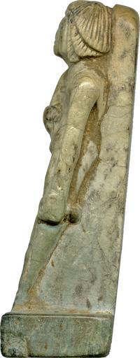 | Keywords: Egyptian - Male Figure - Walters 2266 - Left.jpg This male figure is carved in full relief and probably depicts a king He holds a flexible sceptre in his right hand Front broken including part of shendyt lower half of left leg and left foot; face rubbed Rectangular base with rear column rounded at top reaching to crown of head Left leg in advance Left hand at side holding cloth Right hand before breast holding pliable sceptre or stalk of flowers Short coiffure divided into three parts Short shendyt and has a collar -- Steindorff Catalogue 1946 between 1550 1069 BC New Kingdom light green speckled stone cm 7 02 1 83 1 96 accession number 22 66 37624 Dikran Kelekian New York and Paris date and mode of acquisition unknown Henry Walters Baltimore 1929 mode of acquisition unknown Walters Art Museum Henry Walters Acquired by Henry Walters 1929 place of origin Egypt Walters Art Museum license Ancient Egyptian statuettes in the Walters Art Museum Media contributed by the Walters Art Museum needs category review |