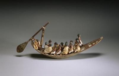 | Keywords: Egyptian - Model of a River Boat - Walters 2218, 2219, 22225 - Profile.jpg Twelve oarsmen a helmsman and a pilot or look-out ferry their passenger the tomb-owner Such models were associated with religious beliefs as they symbolized the journey of the deceased to Abydos the traditional burial place of Osiris lord of the afterworld The tomb-owner is clothed with a shroud and is shown with a blue beard This boat was probably placed in the tomb to assist the deceased in navigating the Nile of the underworld Typically models of passenger ships found in Middle Kingdom tombs occur in pairs One to travel south equipped with a sail as the wind in Egypt blows constantly from north to south and the other as this model shows propelled by rowers aided by the Nile's current to travel north ca 2050 BC Middle Kingdom wood with cloth and paint cm 24 10 57 accession number 22 18 22 19 22 225 77414 Dikran Kelekian New York and Paris Henry Walters Baltimore 1913 rudder oar and post 1916 boat by purchase Walters Art Museum Henry Walters Acquired by Henry Walters 1913 rudder oar and post 1916 boat place of origin Meir Egypt Walters Art Museum license Ancient Egyptian art in the Walters Art Museum Ancient Egyptian models of boats Works of the Egyptian Middle Kingdom |