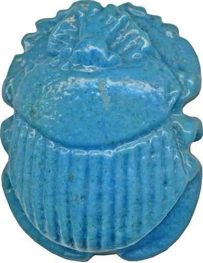Keywords: Egyptian - Naturalistic Scarab - Walters 42365 - Back.jpg The ancient Egyptians believed that the dung beetle the Scarabaeus sacer was one of the manifestations of the sun god Representations of these beetles were used as amulets and for ritual or administrative purposes Naturalistic scarabs such as this were used as part of the amulet set of the mummy They have a naturalistically formed belly and no additional inscriptions or motifs The back of this example is very high and the highest point is the pronotum dorsal plate of the prothorax Pronotum and elytron wing cases are separated by a curved incised partition line and the wing cases by a vertical hatch line pattern The quarter-spherical head is flanked by quarter-spherical eyes that protrude from the head; the trapezoidal side plates are decorated with hatch lines and clypeus has four frontal serrations The proportions of the top are slightly unbalanced the head is small in comparison to plates and clypeus and the pronotum is large in comparison to the elytron The modeled extremities have natural form and hatch notches on the frontlegs for the tibial teeth Two notches are at both side edges and one at the front and rear edge The bottom is naturally formed and an eye protrudes from the center of the belly The bottom structure is standardized and the extremities visible; the round eye with horizontal drill-hole is big and protrudes completely from the body of the beetle The basic form of the scarab is round-oval The scarab is funerary amulet with regenerative function which was attached to mummy bandages between 664 525 BC Late Period light beige faience with blue glaze cm 1 2 1 7 2 2 accession number 42 365 17658 Henry Walters Baltimore date and mode of acquisition unknown Walters Art Museum Henry Walters Acquired by Henry Walters Faience The Colors of the Heavens The Walters Art Museum Baltimore; The Walters Art Museum Baltimore 2003-2004 place of origin Egypt Walters Art Museum license Ancient Egyptian scarabs in the Walters Art Museum Media contributed by the Walters Art Museum needs category review |