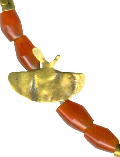 | Keywords: Egyptian - Necklace - Walters 571515 - Detail H.jpg This restrung necklace consists of biconical carnelian beads beads of rolled strips of sheet gold and ten amulets The rooster and couchant animal at either end of the necklace cast of a pale yellow metal probably do not belong Below the rooster at left is a tiny heart amulet of carnelian The other amulets are cut out of sheet gold of varying thickness and have rolled sheet gold loops attached to the back Below the couchant animal at right is an amulet showing a man holding palm branches which symbolized millions of years The six remaining figures are hieroglyphs as well The three birds at left probably represent the sacred ibis of the god Thoth although the long body of one and thick bill of another seem more appropriate to ducks Two amulets show the double crown resting on a basket which signified royal power in Upper and Lower Egypt Another basket amulet has something protruding from it between 2000 1600 BC Middle Kingdom gold and carnelian beads Bird cm 0 67 0 38 ; Ib H 1/16 0 2 x 0 05 cm ; Ibis I cm 0 55 0 79 ; Ibis II cm 0 35 0 3 ; Vulture cm 0 48 0 31 ; Double Crown I cm 0 29 0 22 ; Double Crown II cm 0 56 0 43 ; Neb W 1/8 in 0 05 x 0 39 cm ; Heh cm 0 3 0 51 ; Animal W 1/16 in 0 04 x 0 23 cm accession number 57 1515 24820 Henry Walters Baltimore date and mode of acquisition unknown Walters Art Museum Henry Walters Acquired by Henry Walters Jewelry - Ancient to Modern The Walters Art Gallery Baltimore 1979-1980 place of origin Egypt Walters Art Museum license Ancient Egyptian jewellery in the Walters Art Museum Media contributed by the Walters Art Museum needs category review |