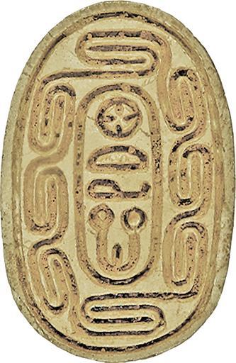 Keywords: Egyptian - Scarab Amulet - Walters 4214 - Bottom.jpg en The ancient Egyptians believed that the dung beetle the Scarabaeus sacer was one of the manifestations of the sun god Representations of these beetles were used as amulets and for ritual or administrative purposes The bottom of this scarab displays a short vertical inscription in an oval frame which refers to the appearance of the sun god It is enclosed by eight elongated Z-shaped interlocked spiral scroll elements The numerical arrangement of the eight spiral scrolls is 1+2x3+1 8 The bottom inscription and spiral décor is very precise and regularly incised and the layout very well organized and symmetrically arranged The highest point of the back is the partition between pronotum dorsal plate of the prothorax and elytron wing cases which is also defined by two short side-notches at shoulder height As additional decoration run two deeply incised branches from the head to the middle of the elytron where they cross each other and end in one lotus blossom The trapezoidal head is flanked by rectangular eyes; the side plates are irregular trapezoidal and the clypeus front plate has five frontal serrations and a central base notch The raised slender extremities have natural form and vertical hatch lines for the tibial teeth and pilosity hair The long-oval base is symmetrically The scarab is longitudinally pierced was originally mounted or threaded and functioned as an amulet It should secure the presence and renewal of the sun god and for a private owner his divine support and renewal eight spiral scrolls The head and the back design with branches secure the dating in the 13th-15th dynasty between 1794 1539 BC late Middle Kingdom-early Second Intermediate light beige steatite originally glazed cm 2 1 3 0 8 accession number 42 14 23010 Prof Newberry Henry Walters Baltimore 1911 by purchase Walters Art Museum Henry Walters Acquired by Henry Walters 1911 Translation The Ka of Re appears place of origin Egypt Walters Art Museum license Ancient Egyptian scarabs in the Walters Art Museum Scarab amulet Hieroglyphs on scarabs City plan town hieroglyph Sunrise hieroglyph Scroll ornaments |