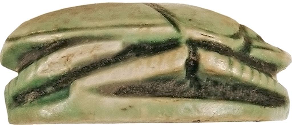 Keywords: Egyptian - Scarab Amulet - Walters 4251 - Right.jpg The ancient Egyptians believed that the dung beetle the Scarabaeus sacer was one of the manifestations of the sun god Representations of these beetles were used as amulets and for ritual or administrative purposes The bottom of this scarab displays the figure of kneeling prisoner with his arms fettered behind the back He wears a headband with curled ends a collar around his neck and a short shendyt with belt; a large nfr-sign is placed in front of him The figure of the captive dominates the scene but the size and placement of the nfr-sign which counterbalances the fettered arms of the captive clarifies that he is part of a perfectly controlled situation The highest point of the back is pronotum dorsal plate of the prothorax and elytron wing cases Both parts have incised borderlines a thick curved partition line and a thick line between the wing cases The semicircular head is flanked by triangular eyes; the plates are irregularly trapezoidal and clypeus has two very small central base marks The proportions of the top are slightly unbalanced the head and clypeus slightly short and the pronotum large in comparison to the elytron The slender extremities have natural form and diagonal hatch lines on the frontlegs for the tibial teeth The oval base is somewhat asymmetrical and smaller at the head part The scarab is longitudinally pierced was originally mounted or threaded and probably served as an amulet It refers to perfect control of chaotic elements enemy and is possibly a statement of the victory over the Kerma Empire Such an amulet should protect its owner from danger It is imaginable that the soldiers who protected the southern borders or participated in military campaigns to the south used it The iconography of the prisoner makes it possible that he represents a man from Kerma the southern enemy of the Egyptians The understanding of the figure as hieroglyph for enemy rebel is also possible but it is more likely that it is a specific icon for the enemies of Kerma who are now perfect because Thutmose I had defeated them between 1504 1492 BC New Kingdom light beige steatite with green glazing cm 1 4 1 1 0 6 accession number 42 51 488 Henry Walters Baltimore date and mode of acquisition unknown Walters Art Museum Henry Walters Acquired by Henry Walters Inscription Icon of a kneeling prisoner with his arms fettered behind the back; he wears a headband with curled ends a collar around his neck and a short kilt with belt; an nfr-sign is placed in front of him place of origin Egypt Walters Art Museum license Ancient Egyptian scarabs in the Walters Art Museum Scarab amulet Media contributed by the Walters Art Museum needs category review |