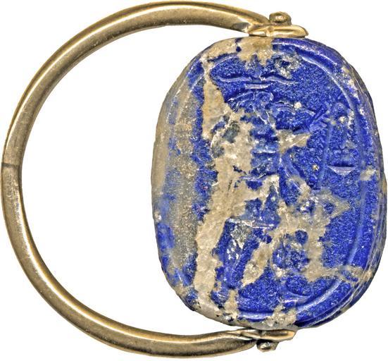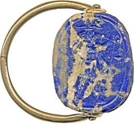 Keywords: Egyptian - Scarab Ring Bezel - Walters 42151 - Bottom.jpg This lapis lazuli scarab has a hawk-head figure wearing a ram's-horn crown carved into the back In his left hand is a staff from which a lotus blossom dangles century 4 BC Late Period-early Greco-Roman lapis lazuli modern gold mount cm 1 1 1 7 2 1 ; Max outer Diam cm 2 4 ; Max inner Diam cm 2 15 accession number 42 151 35459 H Hoffmann Collection until 1899 mode of acquisition unknown Charles Newton-Robinson London date and mode of acquisition unknown Charles Newton-Robinson Sale Christie Manson and Woods London June 22 1909 lot 1 Dikran Kelekian Paris and New York 1909 by purchase Henry Walters city Baltimore Walters Art Museum Henry Walters Acquired by Henry Walters 1909 Jewelry - Ancient to Modern The Walters Art Gallery Baltimore 1979-1980 place of origin Egypt Walters Art Museum license Ancient Egyptian scarabs in the Walters Art Museum Ancient Egyptian finger rings in the Walters Art Museum Thoth |