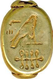 | Keywords: Egyptian - Scarab Ring Bezel - Walters 42388 - Bottom.jpg Sheet gold neatly molded across the back and around the edges of a lapis lazuli scarab forms the surface into which finely detailed hieroglyphs are chased A ring of sheet gold was added around the perforations at either end The inscription reads Chiefs of The Priestly Guild of Horus which suggests that the ring was a mark of professional status between 1186 1070 BC late New Kingdom lapis lazuli gold setting cm 0 7 1 1 5 accession number 42 388 34999 Maurice Nahman Cairo date and mode of acquisition unknown Henry Walters city Baltimore Walters Art Museum Henry Walters Acquired by Henry Walters 1930 Translation Leaders of the priestly group phyle of Horus Jewelry - Ancient to Modern The Walters Art Gallery Baltimore 1979-1980 place of origin Egypt Walters Art Museum license Ancient Egyptian scarabs in the Walters Art Museum Ancient Egyptian finger rings in the Walters Art Museum Jewellery of the 20th dynasty of Egypt Hieroglyphs on metal Horus-falcon hieroglyph Phallus hieroglyph Leg fetter sa hieroglyph |