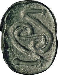 | Keywords: Egyptian - Scarab with Spiral Scrolls - Walters 42391 - Bottom.jpg  This steatite scarab has a flat underside with a vertically arranged bottom design of symmetrical spiral scrolls The design of the back is simple the proportions of the top are almost balanced and the workmanship of the piece is slightly rough This scarab functioned as an amulet with a regenerative connotation It was originally mounted or threaded ca 1648 1539 BC Second Intermediate; Hyksos; late MB IIB black-green steatite cm 0 7 1 1 3 accession number 42 391 9103 Henry Walters Baltimore date and mode of acquisition unknown Walters Art Museum Henry Walters Acquired by Henry Walters place of origin Palestine Walters Art Museum license Ancient Egyptian scarabs in the Walters Art Museum Hyksos scarabs Media contributed by the Walters Art Museum needs category review |