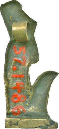 Keywords: Egyptian - Squatting Representation of Mut - Walters 571486 - Reverse.jpg An amulet made of pale sheet gold representing a cloaked figure seated with knees drawn up The figure wears the double crown of Upper and Lower Egypt over a long wig A short sleeve is shown between the flaps of the wig The flat piece appears to have been worked in a mold with the details of the face hands and hair later chased The base to which the figure is attached is solid gold A loop for suspension is attached behind the crown This probably existed during the 30th Dynasty-Ptolemaic Period 380-30 BC Late Period-Greco-Roman gold H 11/16 x W 3/16 1 7 x 0 55 x 0 01 cm accession number 57 1486 7803 Henry Walters Baltimore date and mode of acquisition unknown Walters Art Museum Henry Walters Acquired by Henry Walters Jewelry - Ancient to Modern The Walters Art Gallery Baltimore 1979-1980 place of origin Egypt Walters Art Museum license Ancient Egyptian amulets in the Walters Art Museum Mut amulet Ancient Egyptian jewellery in the Walters Art Museum Media contributed by the Walters Art Museum needs category review |
