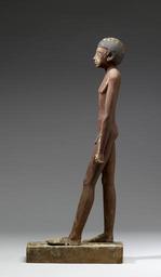 | Keywords: Egyptian - Standing Male Figure - Walters 22211 - Left.jpg For a short period during the late Old Kingdom and the 1st Intermediate Period it was popular to show the tomb's owner without clothes These figures represent the deceased in the phase of renewal in front of the god Osiris lord of the underworld This tomb statue depicts a standing nude male with his left food advanced His body is inclined slightly backward perhaps to give the impression of striding Both of his arms are at his sides and both of his hands are closed This is possibly to indicate that he is holding something but we cannot discern exactly what it is as whatever it is does not extend out of his hands on either side His eyebrows are carved in relief and there are lines at the corners of his nose He wears a short haircut leaving his rather large ears uncovered He has a very deeply carved belly button and his toes are carved so as to be completely separated from each other; his fingers are not carved as deeply The rectangular base that he stands on is original and carries the inscription which reads the sole companion Ha'a The body is painted red the nipples black the hair black the eyes black and white and the base is painted black on the sides and red on its top The front of the left foot the left arm the right arm and the body were all made separately and were attached using dowels as can be seen in the case of the right leg The arms are joined at the shoulders The statue is anchored to the base by means of two wooden dowels which go through the base and through an invisible prong located under the right foot In addition to extensive paint loss in numerous places on the surface of this piece this statue has also suffered structural damage Cracks exist down the length of the base's top; a crack in the top of the back end of the base is filled in probably a modern repair In addition the top of the left foot the right shoulder joint and the back of the right hand are damaged between 2236 2150 BC late Old Kingdom-First Intermediate wood with red white and black paint cm 54 11 7 23 ; H with base cm 53 2 accession number 22 211 40432 Dikran Kelekian New York and Paris date and mode of acquistion unknown as 12th Dynasty Assiout Henry Walters city Baltimore Walters Art Museum Henry Walters Acquired by Henry Walters 1914 Translation On base the sole companion Ha'a Carved for Immortality The Walters Art Museum Baltimore 2004-2005 place of origin Meir Egypt Walters Art Museum license Ancient Egyptian statues in the Walters Art Museum Media contributed by the Walters Art Museum needs category review |