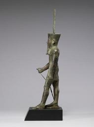 | Keywords: Egyptian - Statue of Amun-Re - Walters 54413 - Left.jpg Amun was one of the most important deities in ancient Egypt He was worshiped at Thebes in southern Egypt from the beginning of the Middle Kingdom 2046 BC The Egyptians considered him to be King of the Gods and divine father of the pharaoh He was also worshiped in Nubia and was the principal god of the Kushite empire in present-day Sudan The style of the figure clarifies that it was made when the Kushites ruled both Egypt and Nubia The god wears his characteristic feather-crown combined with the solar disk of the sun-god Re The attributes he would originally have held were probably the symbols for prosperity was and life ankh ca 680 640 BC Late Period bronze alloy remains of gilding and glass inlay cm 47 6 10 2 13 7 accession number 54 413 32904 Dikran Kelekian New York and Paris Henry Walters city Baltimore Walters Art Museum Henry Walters Acquired by Henry Walters 1911 place of origin Karnak Egypt Walters Art Museum license Ancient Egyptian statues in the Walters Art Museum Statues of the Egyptian late period Statues of Amun-Ra Media contributed by the Walters Art Museum needs category review |