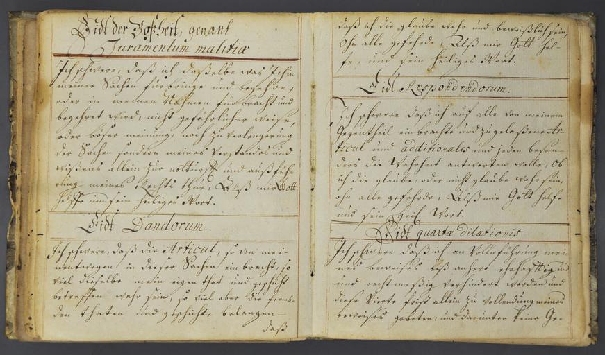 Keywords: Eidesformeln Mecklenburg-Guestrow 04.jpg Undatierte handschriftliche Einträge von Eidesformeln in einem Exemplar in Privatbesitz des Buchs <br /> Des Durchleuchtigsten Fürsten und Herrn/ Herrn Gustaff Adolphen/ Hertzogen zu Mecklenburg Cantzley Ordnung/ Sambt dem Käyserlichen Privilegio de non Appellando und einigen Fürstlichen Rescripten und Constitutionen Scheippel Güstrow 1669 Kanzleiordnung des Gustav Adolf Herzog von Mecklenburg-Güstrow 1633-1695 1 017155S links oben Eidt der Boßheit genant Juramentum malitiae ich schwere daß ich daßelbe was Ich in meiner Sache fürbringen und begehre oder in meinen Nahman fürbracht und begehrt wird nicht gefährlicher weise oder böser meinung noch zu verlengerung der Sachen sondern meines Verstandes und wißens allein zur notturfft und außführung meines Rechts thue Alß mir Gott helffe und sein heilifes Wort links unten und rechts oben Eidt Dandorum Ich schwere daß die Articul so von meinentwegen in dieser Sache einbracht so viel dieselbe mein eigen that und geschicht betreffen wahr sein so viel aber die frembden thaten und geschichte belangen daß´ich die glaube wahr und beweißlich sein Ohn alle gefehrde Alß mir Gott helfe und sein heiliges Wort rechts Mitte Eidt Respondendorum Ich schwere daß ich auf alle von meinem Gegentheil einbrachte und zu gelaßene Articul und additionales und jeden besonders die Wahrheit antworten wolle ob ich die glaube oder nicht glaube wahr sein ohn alle gefehrde Alß mir Gott helfe und sein Heil Wort rechts unten Eidt quarta dilationis Ich schwere daß ich an Vollnführung meines beweises biß anhero ehehafttig und und rechtmeßig verhindert worden und diese Vierte frist allein zu vollendung meines beweises gebeten und darunter keine weite nächste Seite Gefehrde zu verlängerung und auffhalt der Sache gesucht noch gebrauchet Alß mir Gott helfe und sein Heil Wort own 17th/18th century anonymous Book and manuscript is in the Public Domain by age Photograph is released into the Public Domain by the photographer Eidesformeln Mecklenburg-Güstrow Photos by User AndreasPraefcke |