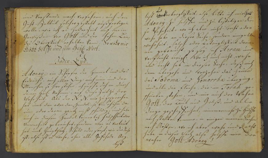 Keywords: Eidesformeln Mecklenburg-Guestrow 08.jpg Undatierte handschriftliche Einträge von Eidesformeln in einem Exemplar in Privatbesitz des Buchs <br /> Des Durchleuchtigsten Fürsten und Herrn/ Herrn Gustaff Adolphen/ Hertzogen zu Mecklenburg Cantzley Ordnung/ Sambt dem Käyserlichen Privilegio de non Appellando und einigen Fürstlichen Rescripten und Constitutionen Scheippel Güstrow 1669 Kanzleiordnung des Gustav Adolf Herzog von Mecklenburg-Güstrow 1633-1695 1 017155S links oben Fortsetzung von File Eidesformeln Mecklenburg-Guestrow 07 jpg links unten und rechts Juden Eyd Adonay ein Schöpfer der Himmel und des Erdreichs auch aller Ding auch mein und der Menschen so hier stehen ich ruffe dich an durch deinen Heil Nahmen auf diese Zeit zu der Wahrheit Als der N N mir zugesprochen hat umb den oder den Handel so bin ich ihm darinne oder davon gantz nicht schuldig und habe auch in diesem Handel keinerley Falschheit oder Unwarheit gebrauchet sondern wie es verlaut hat umb Hauptsach Schuld oder sonst wie die Sache ist also ist es wahr ohne alle Gefährde Arglist // und Verborgligkeit also bitte ich mir Gott Adonay zu helffen und zu bestätigen diese Wahrheit wo ich aber nicht recht oder wahr habe an dieser Sache sondern einige Unwahrheit Falsch- oder Betrügligkeit darinnen gebraucht so sey ich Heram und verflucht ewigl Wo ich auch nicht wahr und recht hab in dieser Sache daß mich dann übergehe und verzehre das Feüer das Sodoma und Gomorrha überging und alle die Flüche die im Torah geschrieben stehen und mir auch der Wahre Gott der Laub und Graß und alle Dinge geschaffen hat nimmermehr zu Hülffe noch noch statten komme in einigen meinen Sachen noch Nöthen wo ich aber wahr und Recht habe in dieser Sach also helffe mir der wahre Gott Adonay own 17th/18th century anonymous Book and manuscript is in the Public Domain by age Photograph is released into the Public Domain by the photographer Eidesformeln Mecklenburg-Güstrow Judaism in Germany Photos by User AndreasPraefcke Sodom |