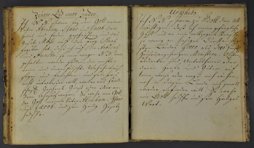 | Keywords: Eidesformeln Mecklenburg-Guestrow 09.jpg Undatierte handschriftliche Einträge von Eidesformeln in einem Exemplar in Privatbesitz des Buchs <br /> Des Durchleuchtigsten Fürsten und Herrn/ Herrn Gustaff Adolphen/ Hertzogen zu Mecklenburg Cantzley Ordnung/ Sambt dem Käyserlichen Privilegio de non Appellando und einigen Fürstlichen Rescripten und Constitutionen Scheippel Güstrow 1669 Kanzleiordnung des Gustav Adolf Herzog von Mecklenburg-Güstrow 1633-1695 1 017155S links Zeügen Eyd eines Juden Ich N N schwere bey dem Gott meiner Väter Abraham Isaac und Jacob der Himmel und Erde geschaffen und das Gesetz Mosi auf den Berg Sinay gegeben hat daß ich auf die Articul und Punite so mir wegen N N vorgehalten werden sollen die rechte eine und unverfälschte Wahrheit aussagen und berichten und solches nicht unterlaßen will weder aus Feindschafft Geschenck Gunst oder einer anderen Ursach wegen So wahr mir Gott der Gott meiner Väter Abraham Isaac und Jacob und sein Heilig Gesetz helffe rechts Urphede own 17th/18th century anonymous Book and manuscript is in the Public Domain by age Photograph is released into the Public Domain by the photographer <gallery> File Eidesformeln Mecklenburg-Guestrow Urfehde jpg rechte Seite Urphede mit Transkription </gallery> Eidesformeln Mecklenburg-Güstrow Judaism in Germany Photos by User AndreasPraefcke |