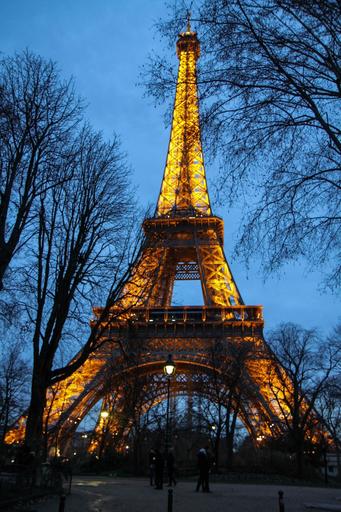 Keywords: eiffel tower trees branches evening illuminated lights twilight sunset dusk paris france landmark architecture famous monument symbol cityscape metal