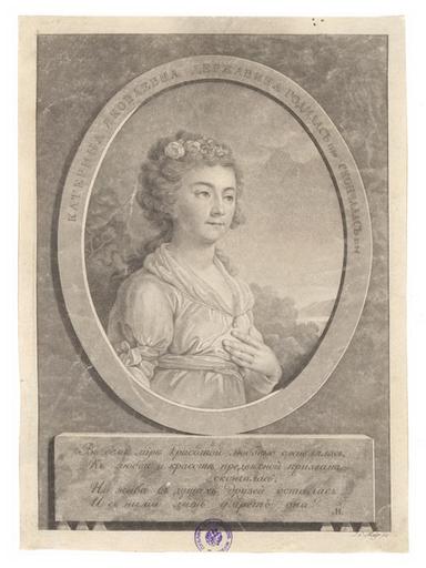 | Keywords: Ekaterina Yakovlevna Derzhavina2.png АЙР ИОГА -ХРИСТОФ MAYR JOHANN CHRISTOPH 1764 ю нбе г - 1812 Санкт-Пете бу г ПОРТРЕТ Е Я ДЕРЖАВИ ОЙ После 1794 По о игиналу В Л Бо овиковского Офо т акватинта 290х210 мм лист об езан 1-ое состояние Внизу сп ава J C Maӱr sc По овалу кате ина яковлевна де жавина одилась 1760 скончалась 1794 Под медальоном четве остишие Въ семъ мi ѣ к асотой любовью оживлялась Къ любви и к асотѣ п едвѣчной п извана скончалась; о жива въ душахъ д узей осталась И съ ними лишь ум етъ она иже моног амма из букв А П оисхождение cоб ание Д А Ровинского Санкт-Пете бу г ; Румянцевский музей с 1898 ; в Г ИИ с 1924 Инв ГР-2565 Сп авочники Ровинский Д А Под обный слова ь усских г ави ованных по т етов СПб 1886 - 1889 Т 1 стб 659 - 660; Ровинский Д А Под обный слова ь усских г аве ов XVI - XIX веков СПб 1895 Т 2 стб 608 7 Д угие состояния г авю ы По т ет Е Я Де жавиной Авто посвящения - А Львов о чем свидетельствует моног амма в нижней части Во вто ом состоянии стихи исп авлены Де жавиным см д угое состояние г авю ы http //www russianprints ru/printmakers/m/mayr_johann_christoph/portrait_ekaterina_derzhavina shtml 19th c engraving after V Borovikovskiy Ekaterina Yakovlevna Derzhavina Files uploaded by Shakko from various sources PD-old |