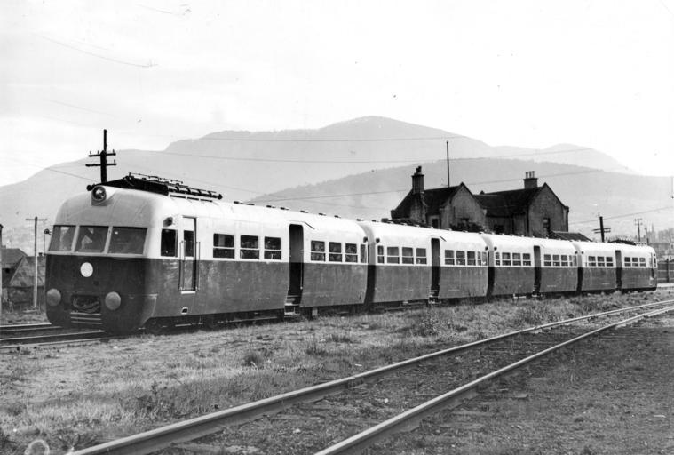 MAKE A MEME View Large Image Publicity portrait of new Tasmanian Government Railways four car railcar set in Hobart yard. Would be 1945 with two powered units from DP20 to 24 and driving trailers PT5 and 6. Built by Waddingtons in Sydney using Drewry power bogies and ...