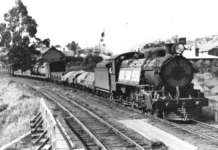 | Keywords: train railway locomotive tasmania steam narrow gauge blackandwhite monochrome vehicle outdoor railroad black and white A Q on a Royal Hobart Show goods special nearing Moonah Station. TGR photo 3T56. Ted Lidster collection A Q on a Royal Hobart Show goods special nearing Moonah Station. TGR photo 3T56. Ted Lidster collection |