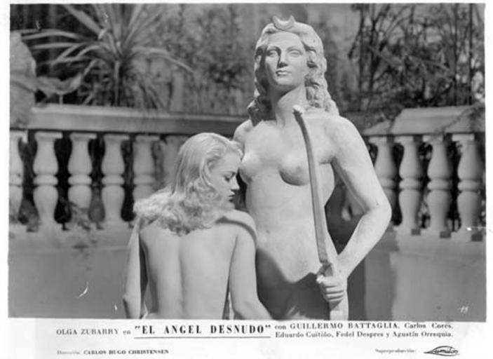 Keywords: El ángel desnudo.jpg es Fotografía blanco y negro sobre papel fotográfico brillante marca Ridax con marco perimetral blanco en cuyo borde inferior se hallan impresos los datos del El ángel desnudo Plano corto de medio cuerpo de la protagonista Olga Zubarry desnuda y de espaldas en una terraza La actriz con el rostro de perfil derecho se halla sentada por delante de una estatua femenina desnuda con una media luna en la frente y un arco en la mano Por detrás una baranda semicircular de mampostería y al fondo vegetación http //www acceder buenosaires gov ar/es/td Fotografias 26/582250 1946 Christensen Carlos Hugo PD-AR-Photo DEFAULTSORT angel desnudo El El ángel desnudo Olga Zubarry Black and white photographs of Argentina Toplessness in film Statues |