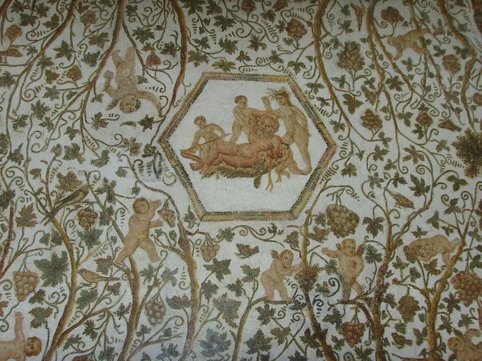Keywords: El Jem Museum (7).JPG en An ancient Roman mosaic in El Jem Museum in Tunisia Third century Mosaic representing multiple scenes fr Mosaïque du musée archéologique d'El Jem Tunisie datant du III e siècle et provenant de la maison de Silène Y figure des scènes multiples Le ligotage de Silène un vieillard en permanence ivre que l'on voit au milieu de la mosaïque étendu sur un lit de feuillage Autour de lui trois enfants essaient de lui attacher mains et pieds grâce à une guirlande de fleurs tressées De plus Églé autoritaire lève la main droite en direction de Silène Aux quatre angles de la mosaïque sont représentés des cratères d'où s'échappent des ceps de vigne chargés de raisins et un feuillage confus à l'intérieur desquels on voit des Amours vendangeurs un lion une lionne un chameau Hercule calmant un éléphant furieux un escargot une sauterelle un rat et de multiples oiseaux Own Effi Schweizer 2009-03-18 Silenus mosaic in the El Jem museum Silenus mosaic in El Jem museum |