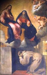 | Keywords: El jubileo de la Porciúncula, de Francisco Fernández (Real Academia de Bellas Artes de San Fernando).jpg La obra representa a San Francisco de Asís el fundador de la Orden de los franciscanos recibiendo de manos de Jesucristo y de la Virgen María la Indulgencia o el Jubileo de la Porciúncula ya que en 1216 el papa Honorio III concedió una indulgencia plenaria a todos aquellos que visitaran la pequeña iglesia de la Porciúncula que está situada en el interior de la basílica de Nuestra Señora de los Ángeles de Asís en Italia Siglo XVII oil on canvas Size cm 155 285 Institution Real Academia de Bellas Artes de San Fernando http //ceres mcu es/pages/Main accession number 0861 http //ceres mcu es/pages/Main PD-old-100 Saint Francis receives the Indulgence of Portiuncola 1216 17th-century paintings in the Royal Academy of Fine Arts of San Fernando Francisco Fernández |
