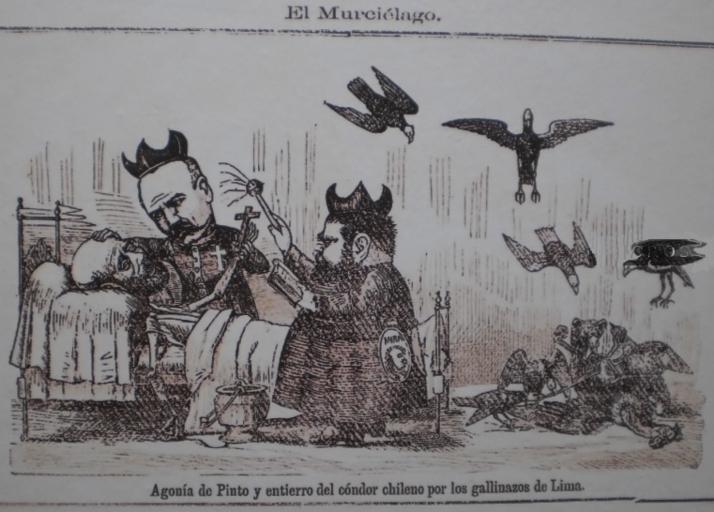 | Keywords: El Murciélago nº 30. Lima 30 de julio de 1879.png es Agonía de Pinto y entierro del cóndor chileno por los gallinazos de Lima El Murciélago nº 30 Lima 30 de julio de 1879 p 127 Xilografía sobre papel Aníbal Pinto agoniza acompañado de los escritores Vicuña Mackenna y Rafael Vial A un lado los gallinazos de Lima derrotan al símbolo de Chile http //guillermoamoros wordpress com/2009/01/24/imagenes-de-la-guerra-contra-chile-renzo-babilonia-fernandez-baca/ Magazine El Murciélago nº 30 Lima 30 de julio de 1879 p 127 1879 PD-old Image has a water mark from blog Peruvian Caricatures in the War of the Pacific Anibal Pinto Caricatures of politicians of Chile Benjamín Vicuña Mackenna |
