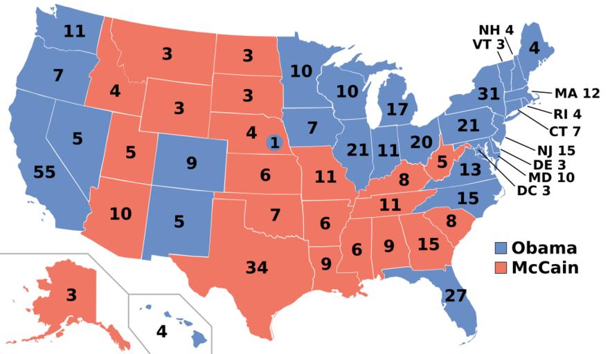 | Keywords: ElectoralCollege2008.svg US presidential election maps SVG Electoral college map for the 2008 United States presidential election note Nebraska and Maine split their EVs by congressional district If you would like to contribute to this file download a free SVG editing program such as Inkscape or something similar to do so <br><br>Please only update the map when a state is projected SAFE after the final polling place is closed Do not crystal ball the results Wait until at least three news organizations call a state before changing the colour see http //pollster com Pollster com to see who has called what Sources used http //www pollster com Pollster com http //www cnn com/ELECTION/2008/results/president/ CNN com http //www msnbc msn com/id/23887017 MSNBC com http //hosted ap org/specials/election_night_2008/election_map_premium/index html SITE MASPDELN AP org http //elections foxnews com/states_map/index html FOXNews com and the http //www omaha com/index php u_page 2835 u_sid 10481441 Omaha World Herald Own Gage 2008-08-05 2008 U S presidential election maps state subdivisions SVG Support This document is in the Scalable Vector Graphic format SVG and requires a supported browser Opera 9 Firefox 2 or a SVG plugin for Internet Explorer and other browsers SVG is an open source format which means this map can be downloaded and modified/translated completely using a vector graphics editor like Adobe Illustrator or Inkscape free or a text editor such as Notepad wikitable background red; color white align center BLANK THUMBNAIL View large PNG View medium PNG SVG Plugin for Internet Explorer and other browsers - <span class plainlinks > fullurl FULLPAGENAME purge Click here purge cache </span> and then CTRL+F5 to reload Help http //upload wikimedia org/wikipedia/commons/thumb/a/ab/ PAGENAMEE /1024px- PAGENAMEE png Try 1 http //upload wikimedia org/wikipedia/commons/thumb/b/ab/ PAGENAMEE /1024px- PAGENAMEE png Try 2 http //upload wikimedia org/wikipedia/commons/thumb/a/ab/ PAGENAMEE /900px- PAGENAMEE png Try 1 http //upload wikimedia org/wikipedia/commons/thumb/b/ab/ PAGENAMEE /900px- PAGENAMEE png Try 2 http //www adobe com/svg/viewer/install/ Adobe SVG plugin - Recommended browser More Help - http //www opera com/download Opera 9 1 http //www openclipart org/wiki/SVG_Tools List of SVG tools |