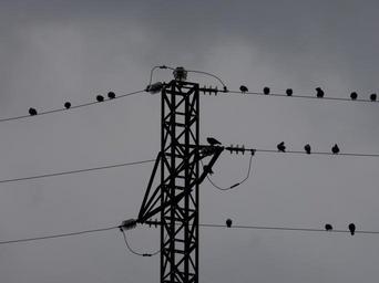 Keywords: electric cables pigeons birds electrical tower cloudy