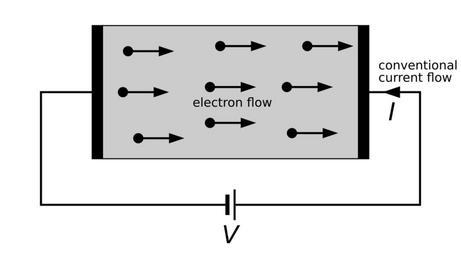 Keywords: Electron flow in a conductor.svg Diagram of the electron flow in a conductor with the direction of the conventional current shown own Own drawing 10/02/07 inductiveload Electric current