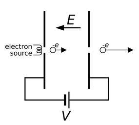 MAKE A MEME View Large Image Electron gun.svg A simple electron gun using a potneial differnece between two plates to accelerate electrons own Own drawing 10/02/07 inductiveload SVG electrical symbols Electron guns