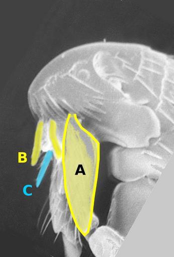 | Keywords: Electron Micrograph of Flea derivate.jpg en Scanning Electron Micrograph of a Flea See below for a colorized version of this image Fleas are known to carry a number of diseases that are transferable to human beings through their bites Included in this infections is the plague caused by the bacterium Yersinia pestis yellow A Galea yellow B maxillar palp blue C labial palp Une puce observée en microscopie électronique Les puces transmettent de nombreuses maladies qu'elles peuvent transmettre à l'homme par leur morsures Parmi ces maladies on trouve la peste causée par la bactérie Yersinia pestis Scanning_Electron_Micrograph_of_a_Flea jpg 2011-03-06 09 50 UTC Scanning_Electron_Micrograph_of_a_Flea jpg Content Provider s Centers for Disease Control and Prevention CDC / Janice Carr derivative work Siga enlarged turned cut partly coloured to show homolog parts Siga Scanning_Electron_Micrograph_of_a_Flea jpg PD-USGov Original upload log This image is a derivative work of the following images File Scanning_Electron_Micrograph_of_a_Flea jpg licensed with Cc-pd-mark-footer PD-USGov 2005-08-28T12 19 12Z Dodo 387x499 40666 Bytes <nowiki>Scanning Electron Micrograph of a Flea Source http //phil cdc gov/ photo id 240 Content Provider s Centers for Disease Control and Prevention CDC / Janice Carr License public domain PD-USGov </nowiki> 2005-04-23T13 36 32Z Muriel Gottrop 387x499 40666 Bytes <nowiki>Scanning Electron Micrograph of a Flea; public domain from http //phil cdc gov/ http //phil cdc gov/phil/detail asp id 240 Content Provider s Centers for Disease Control and Prevention CDC / Janice Carr PD Cat</nowiki> Uploaded with derivativeFX Scanning electron microscopic images of Arthropoda Unidentified Siphonaptera Siphonaptera mouthparts |