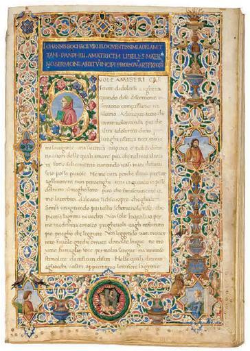 | Keywords: Elegia di Madonna Fiammetta 2.jpg 30 Giovanni Boccaccio Elegia di Madonna Fiammetta Manuscript on vellum in Italian illuminated by Attavante degli Attavanti Italy Florence c 1480 267 x 183 mm 128 leaves text complete I-XII10 XIII10-1 Catchwords throughout “ Written space 183 x 90 mm 27 lines per page Text in Italian in a neat humanistic script in dark brown ink 133 two-line initials in gold on blue ground with white penwork decoration and filled with pink and green with yellow penwork 8 five- to six-line vine-stem initials Title page with full border and historiated initial “ Some rubbing to the title page the right lower corner of fol 103 replaced otherwise in fine condition Final leaf of the last quire pasted onto the back cover “ Contemporary binding Northern Italian probably Venetian not later than 1510 cf De Marinis 1960 vol 2 p 1616 pl CCLXXV and De Marinis 1966 p 118 blind-tooled brown calf over wooden boards using four different tools four raised bands gilt edges One vellum flyleaf at the front clasps missing ends of spine expertly restored http //guenther-rarebooks com/catalog-online/30 php ~ 1480 Attavante degli Attavant PD-old-100 Fiammetta Renaissance illuminated manuscripts from Italy Files uploaded by Shakko from various sources Historiated initials from illuminated manuscripts |