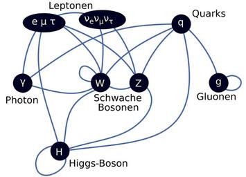 | Keywords: Elementary particle interactions-de.svg Version with german text cleaned up source code A diagram summarizing the tree-level interactions between elementary particles described in the Standard Model Vertices darkened circles represent types of particles and edges blue arcs connecting them represent interactions that can take place The organization of the diagram is as follows the top row of vertices leptons and quarks are the matter particles; the second row of vertices photon W/Z gluons are the force mediating particles; and the bottom row is the Higgs boson en Image Elementary particle interactions svg 2007-01-14 2008-02-03 2016-06-28 en User TriTertButoxy User Stannered User Doktorchen <gallery> File Elementary particle interactions svg English version </gallery> Standardmodell |