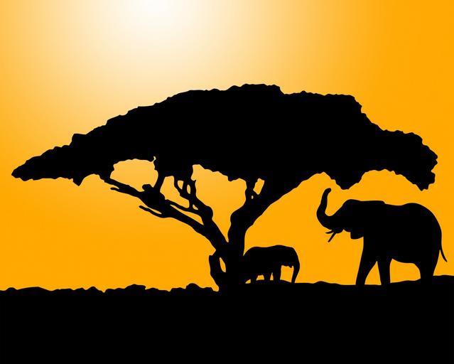 Keywords: elephant elephants animal animals black silhouette sunrise sunset tree acacia orange art shape outline young baby