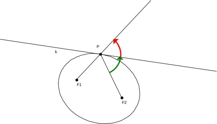 Keywords: Elipse tangent.svg k is a tangent of elipse and P is the tangency point The tangent is bisector of exterior angle in triangle F1F2P green and red angles are equal Own 2007-05-20 MatFizka Tangent vectors Ellipses